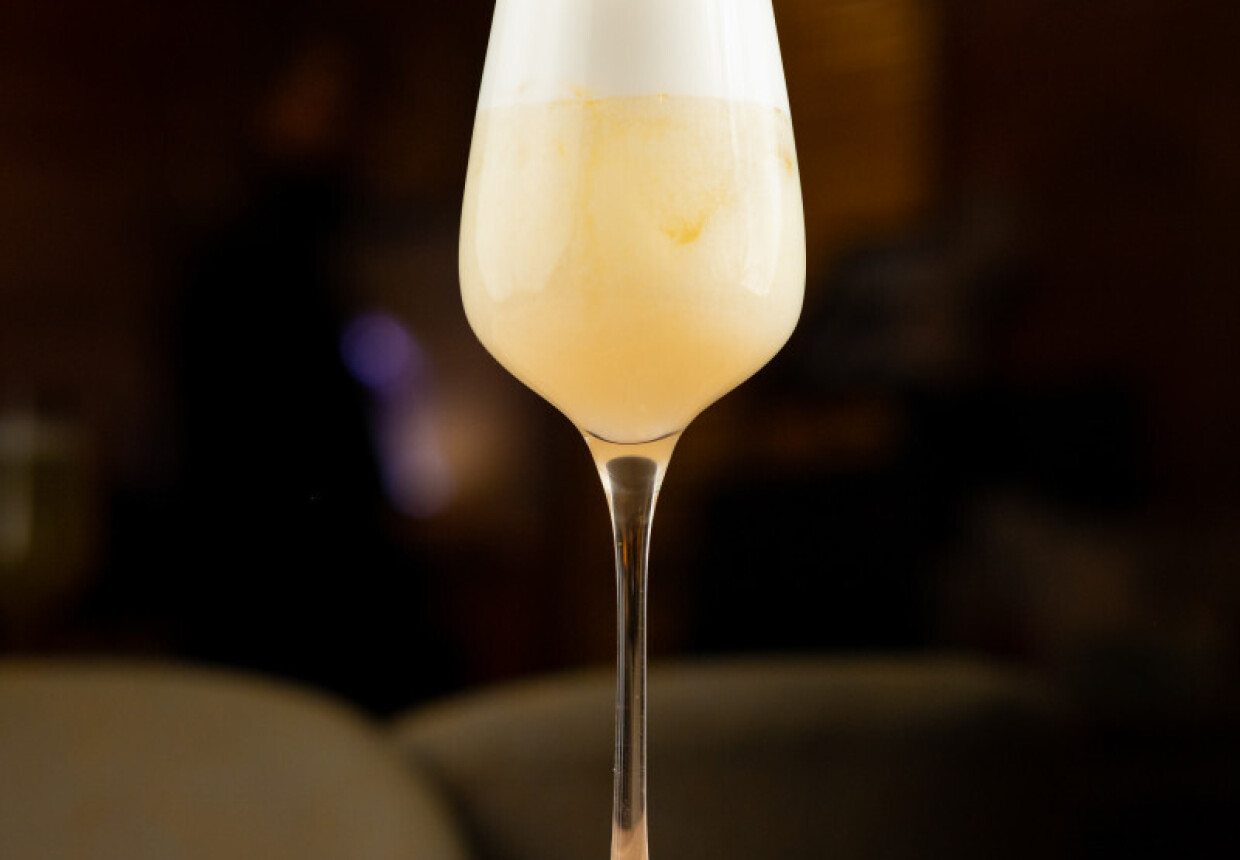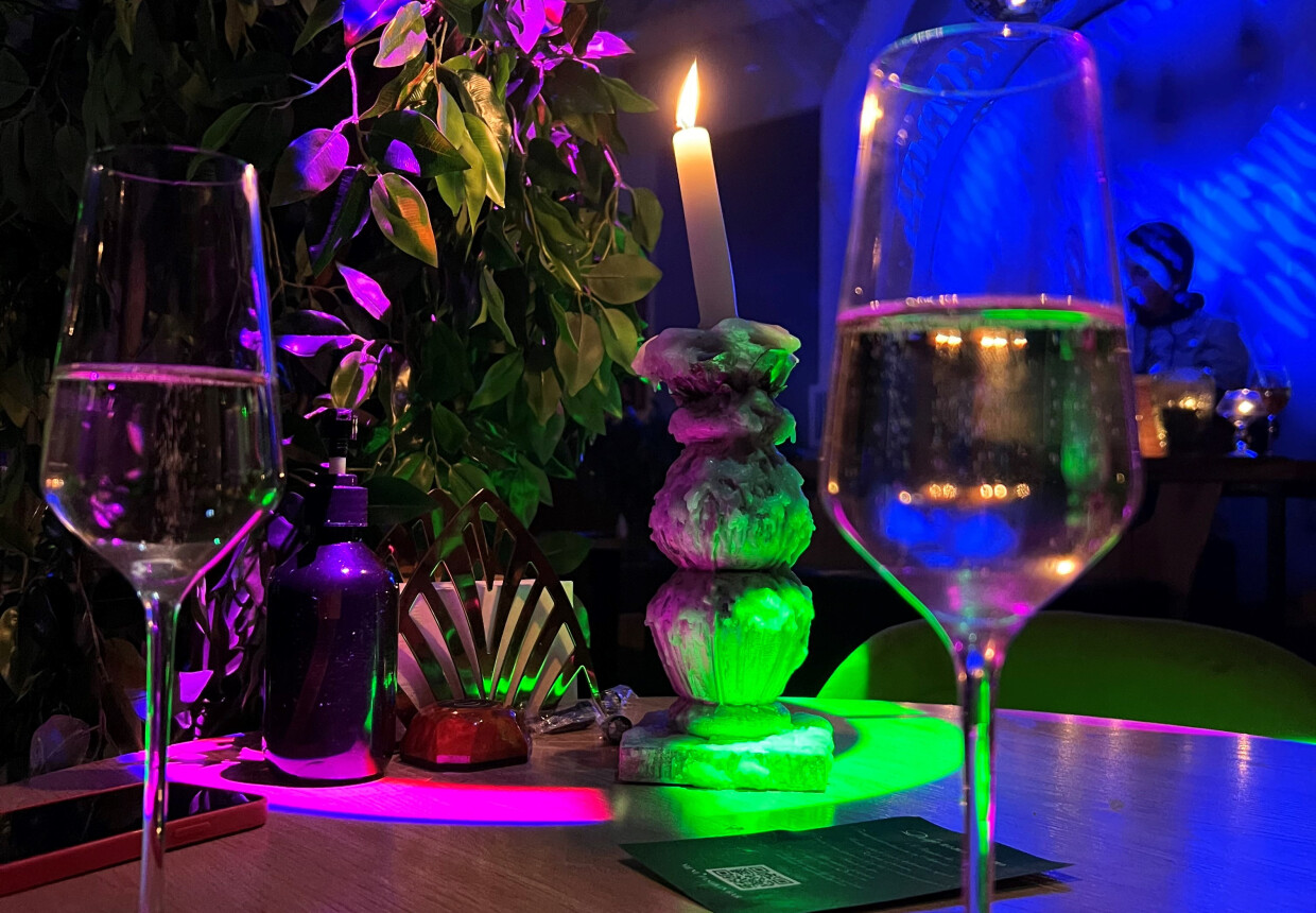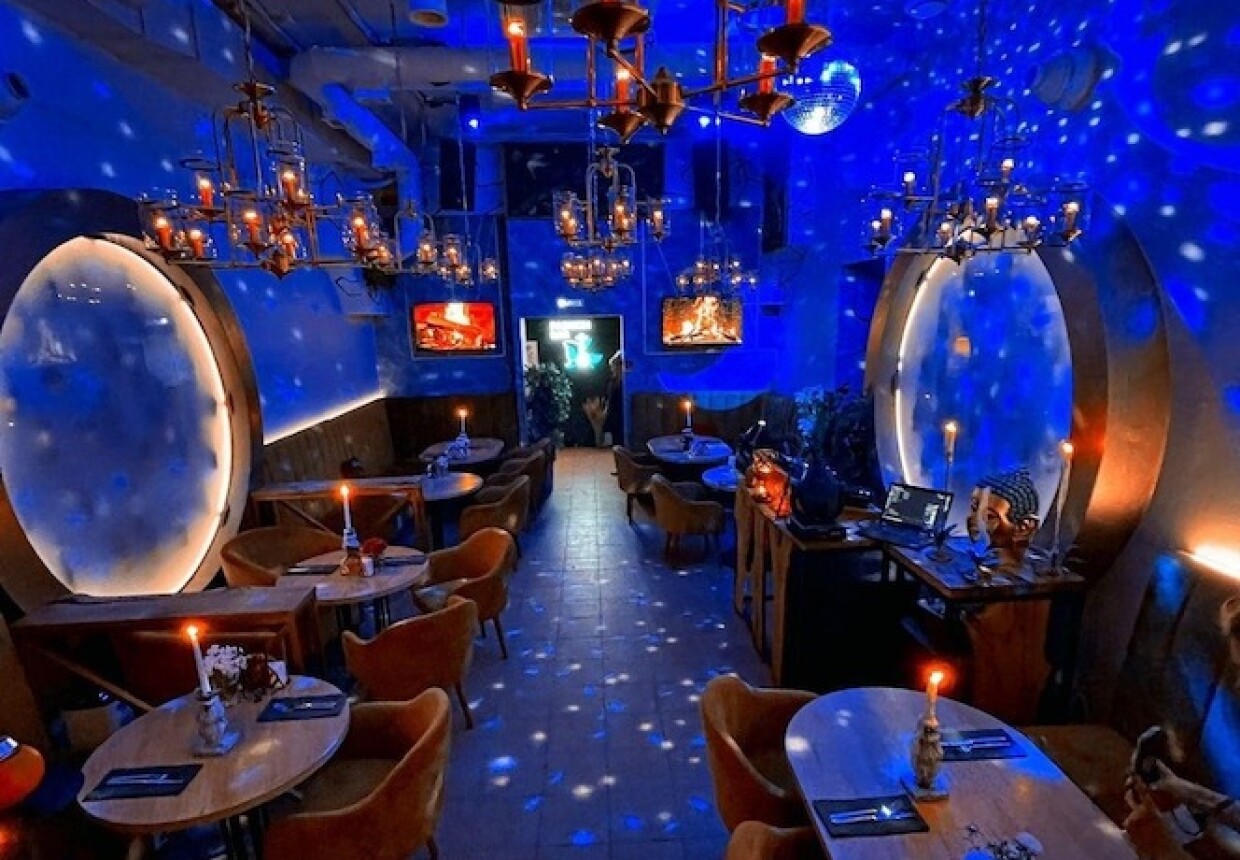 Внутри — уютный зал в бежевых тонах с мягкими диванами и массивными канделябрами. Но с наступлением ночи атмосфера здесь становится почти мистической благодаря космическому синему свету. Приходите в соответствующем наряде — в баре действует дресс-код.