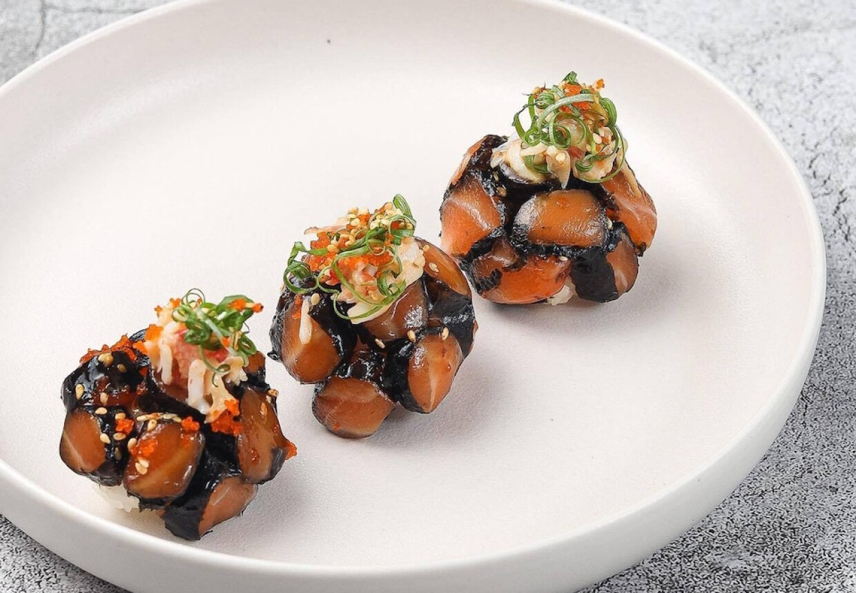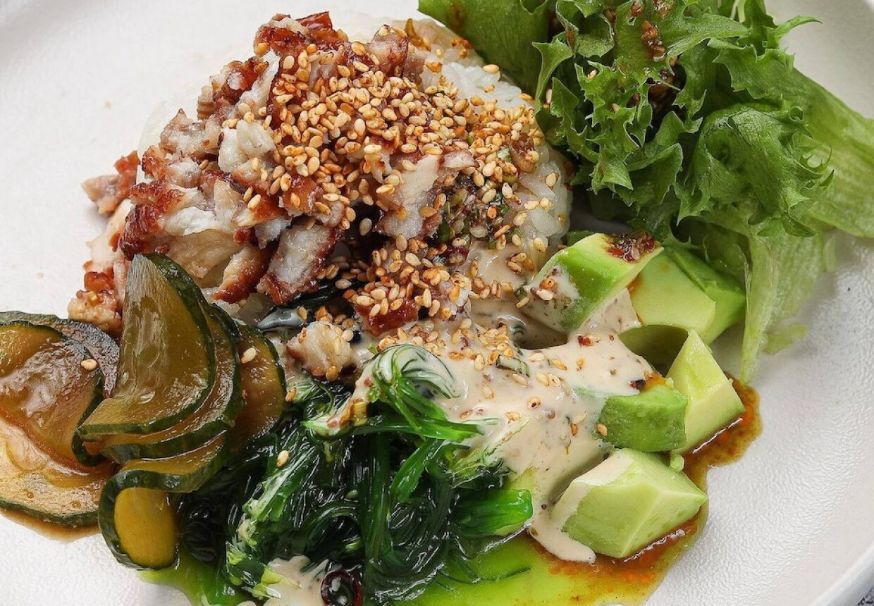 В меню — блюда европейской и паназиатской кухни: паста, пицца, вок, роллы и поке. Из необычного: лазанья с телячьими щёчками, креветки в ореховой панировке и карпаччо из фарерского лосося и манго. На десерт предлагают кокосовый киндер с ягодами и пирожное шу с эффектной подачей.