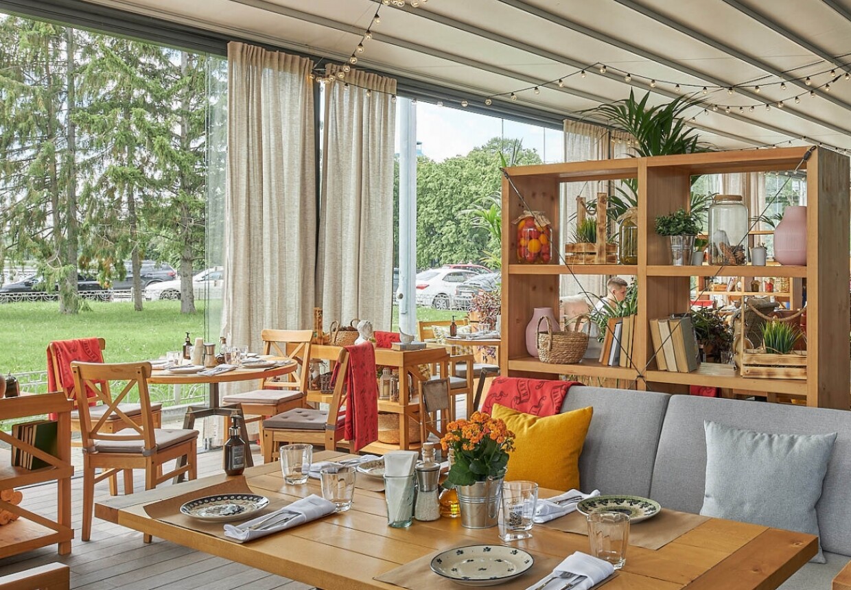 Дизайн и меню создали по образцу столичных проектов. Внутри — светлое современное пространство, панорамные окна на реку, пышная зелень в кадках задает средиземноморское настроение.