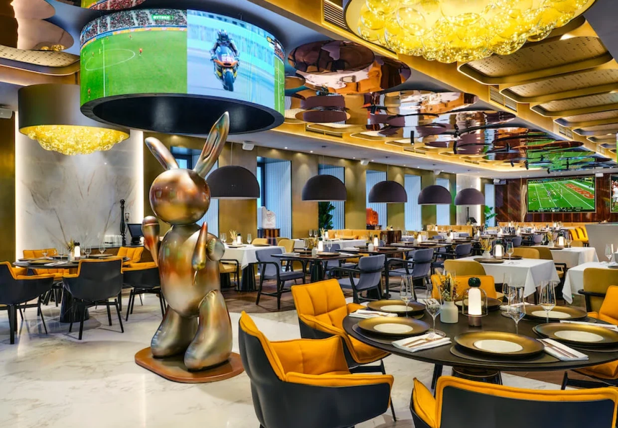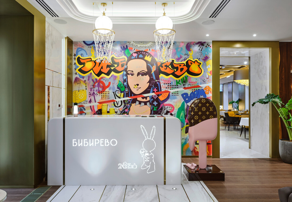 В семейном гастрономическом ресторане Бибирево иронизируют над зависимостью от популярных брендов, предлагая отдохнуть с бокалом пенного под фигурой зайца от художника Джеффа Кунса.