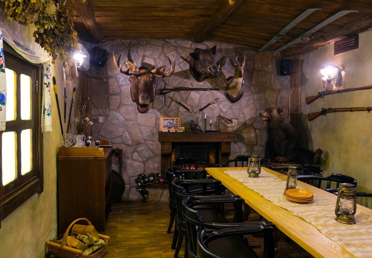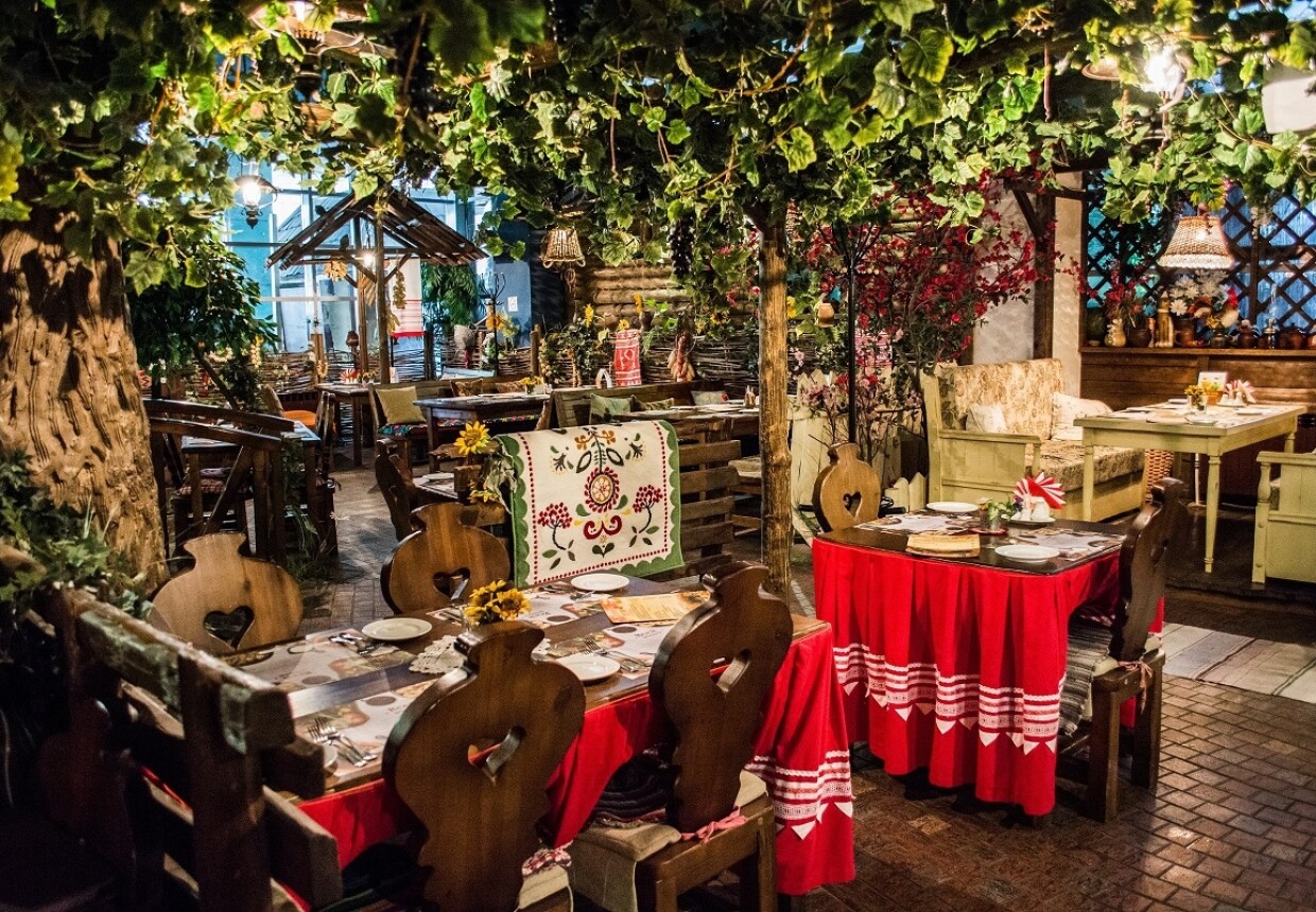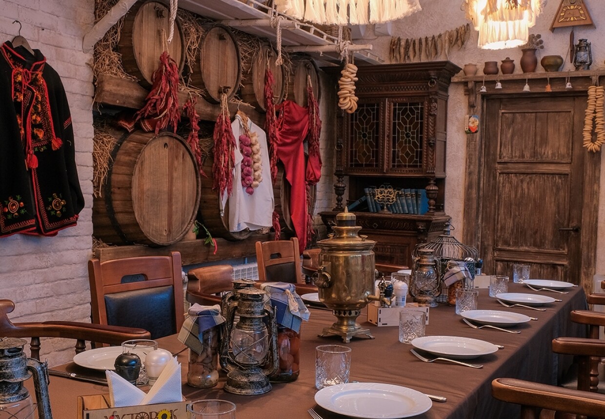 Интерьер сразу переносит в украинскую избу конца 19 — начала 20 веков, где каждый элемент передает народные особенности Украины: красные и белые цвета, небольшие деревянные оконца, художественная роспись на стенах, яркие занавески, ковры и скатерти с цветочным орнаментом, дровяная печь, старинные плафоны, резная мебель.