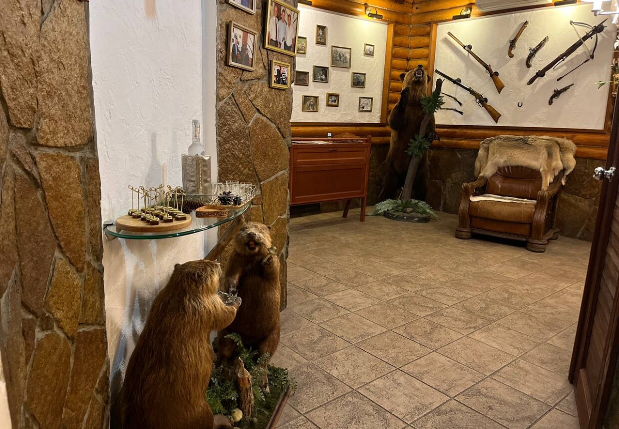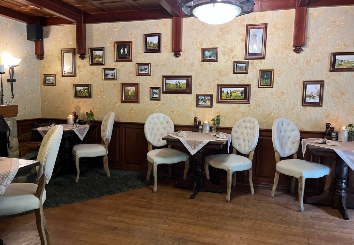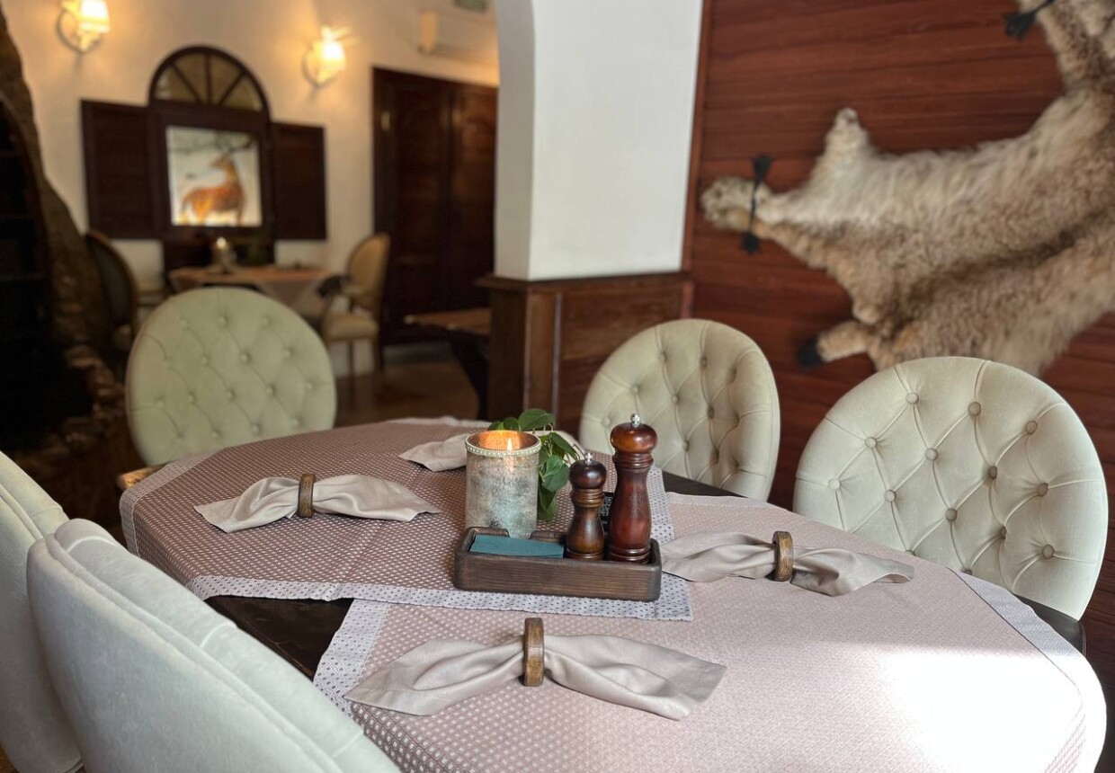 К столу подают блюда из медвежатины и лосятины, оленины, крольчатины и косули. Всюду вас окружают предметы староукладческого быта, шкуры и чучела птиц и зверей, а улыбчивые официанты в нарядах охотниц готовы выполнить любое ваше пожелание. Колоритный интерьер, безупречное качество и великолепная атмосфера охотничьего домика.