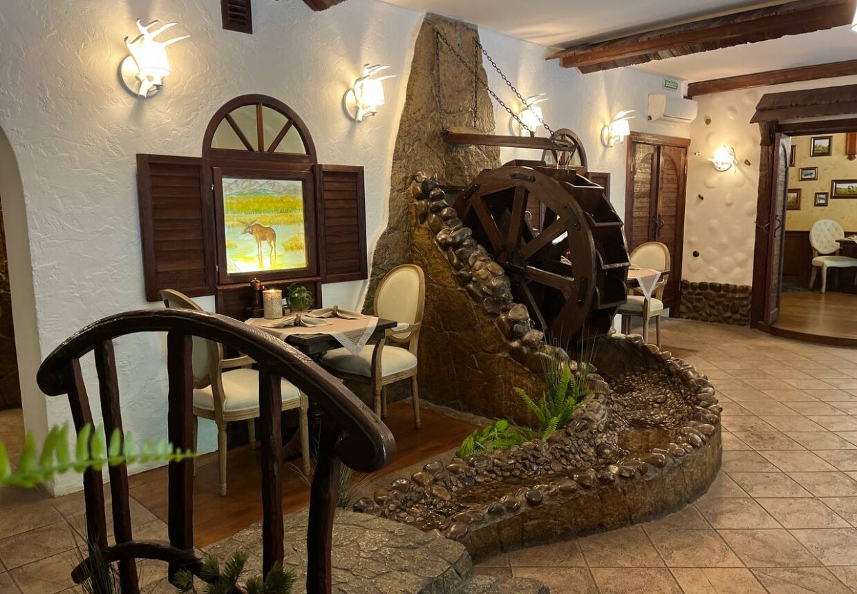 Внутри — все атрибуты охотничьего домика в таёжной глуши: шкуры животных, чучела и стенд с ружьями. Выстрелят ли они в конце трапезы — уточняйте на месте. Для пущего антуража тут установили водяную мельницу и развесили по стенам пейзажные зарисовки.