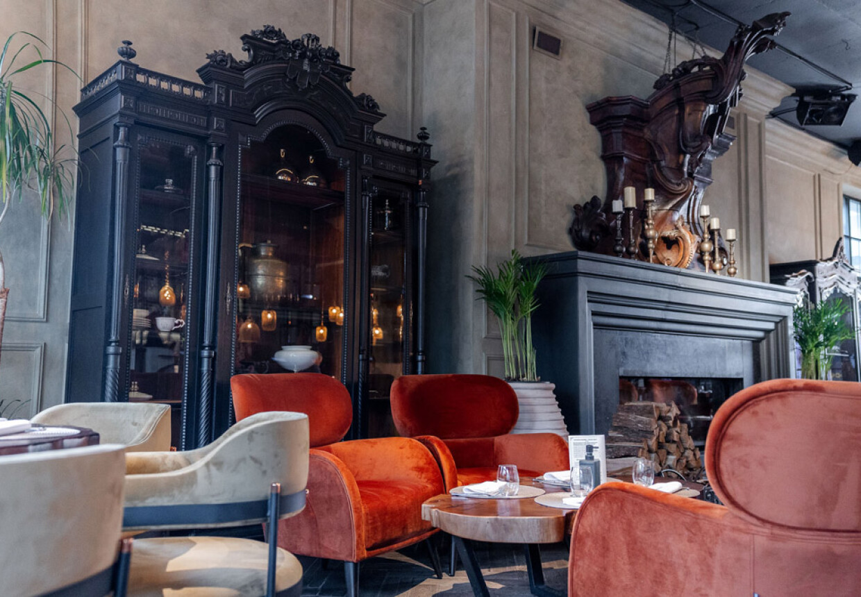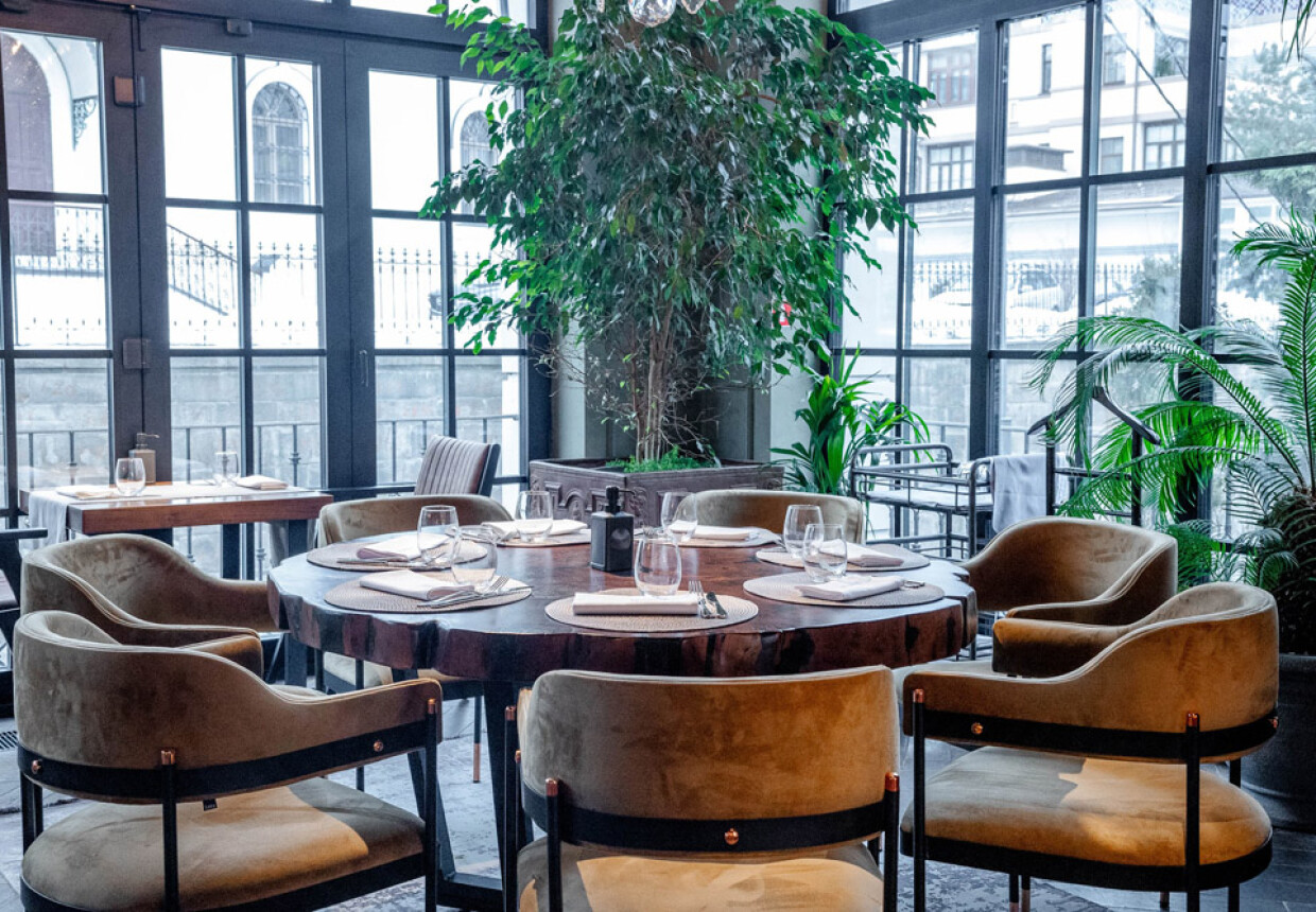 Ресторан расположен в историческом особняке. Интерьер оформлен в стиле неоклассики и отличается сдержанной роскошью. На двух этажах разместились просторные залы с панорамными окнами. Мебель из массива ценных пород дерева соседствуют с винтажными резными буфетами, кожаные кресла — с велюровыми диванчиками. Освещают залы массивные хрустальные люстры, украшением служат пышные живые растения. Пространство разделено на несколько зон, каждая из которых получила своё визуальное решение. Большая терраса в два этажа не уступает в пышности настоящим оранжереям.