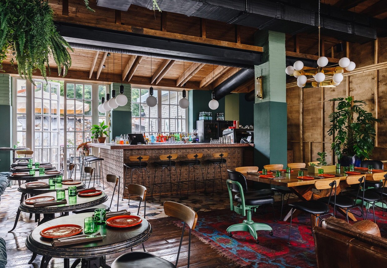 Интерьеры Blanc погружены в глубокий зеленый: стены и кресла в сочных оттенках джунглей дополняются обилием горшков и кадок с южными растениям, а так же коллажами и декоративными элементами на тропическую тематику. Оттеняет буйство зелени темная древесина, тускло-розоватая плитка, латунь и матовый белый. Огромные панорамные окна с тонкими переплетами, винтажная картотека и милые вещицы из советского прошлого добавляют интерьеру оригинальности.