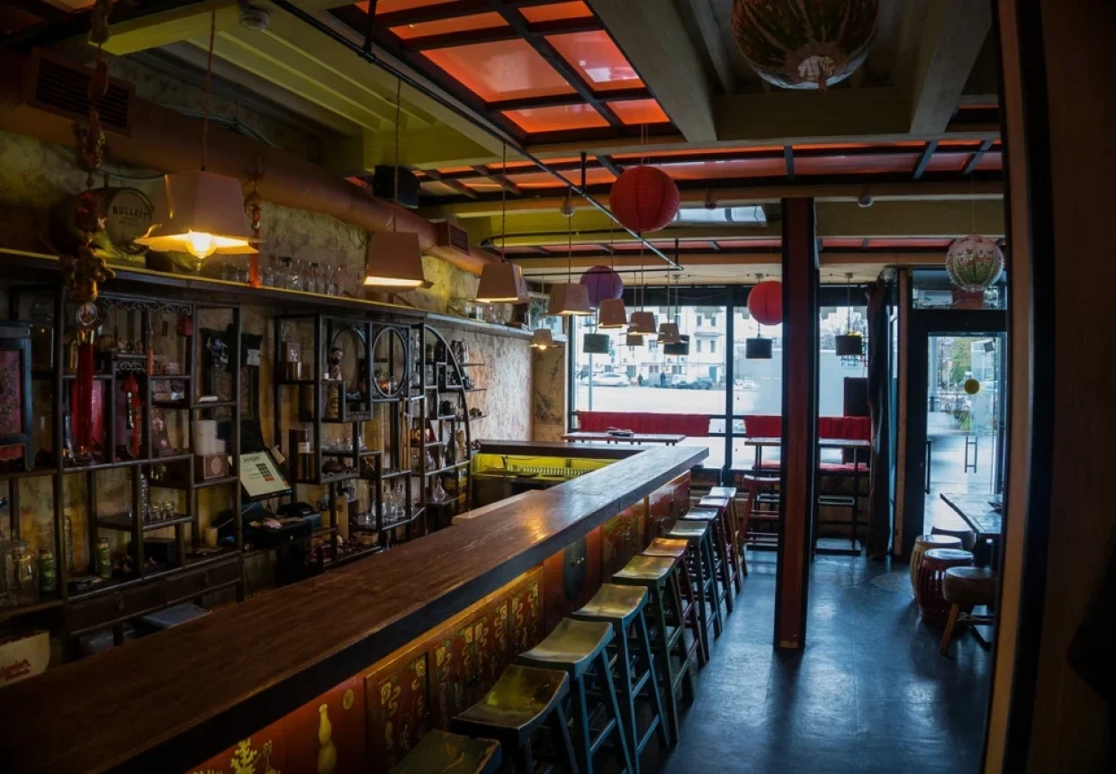 В основном зале кафе установлена стойка, собранная из винтажных разноцветных комодов. Простота лофта сочетается с традициями уличных заведений Гонконга. Стулья с вытертой красной дополняют палитру оттенками зелёного, синего, красного и жёлтого. У больших окон расставлены диванчики, вдоль стойки протянулся ряд табуретов, на втором этаже — лаконичная мебель из металла и дерева. Столешницы из массива раскрашены яркими квадратами, барную стойку украшают фигурки омаров.