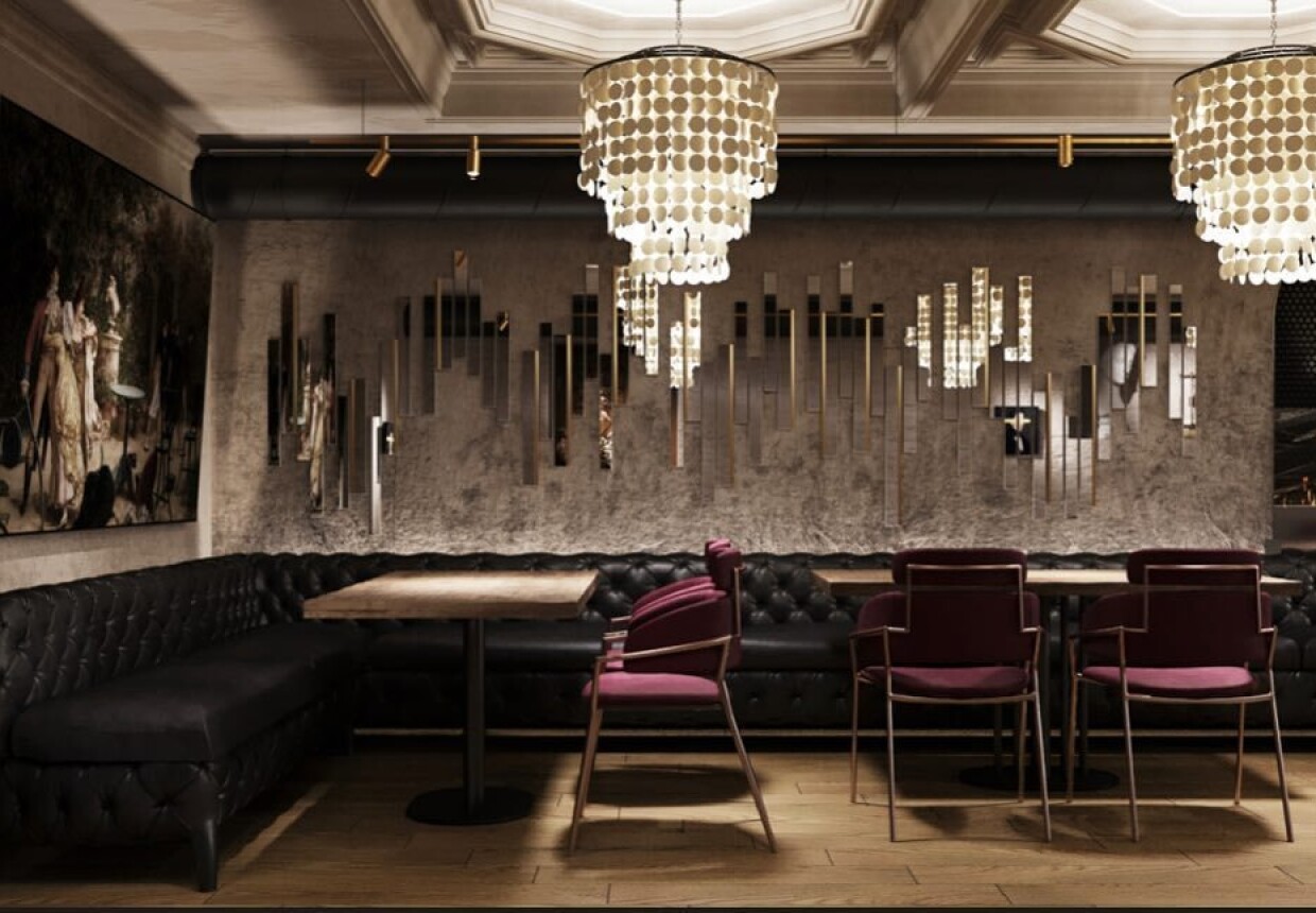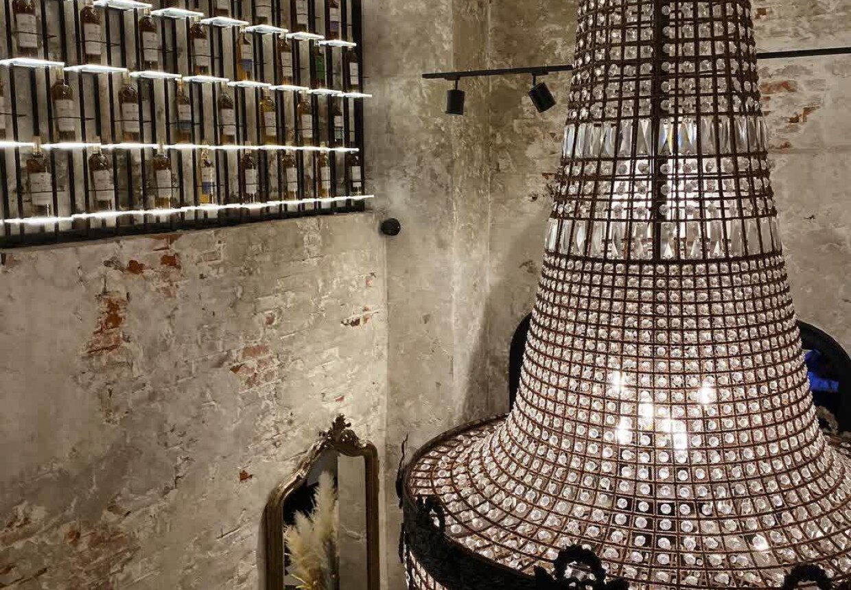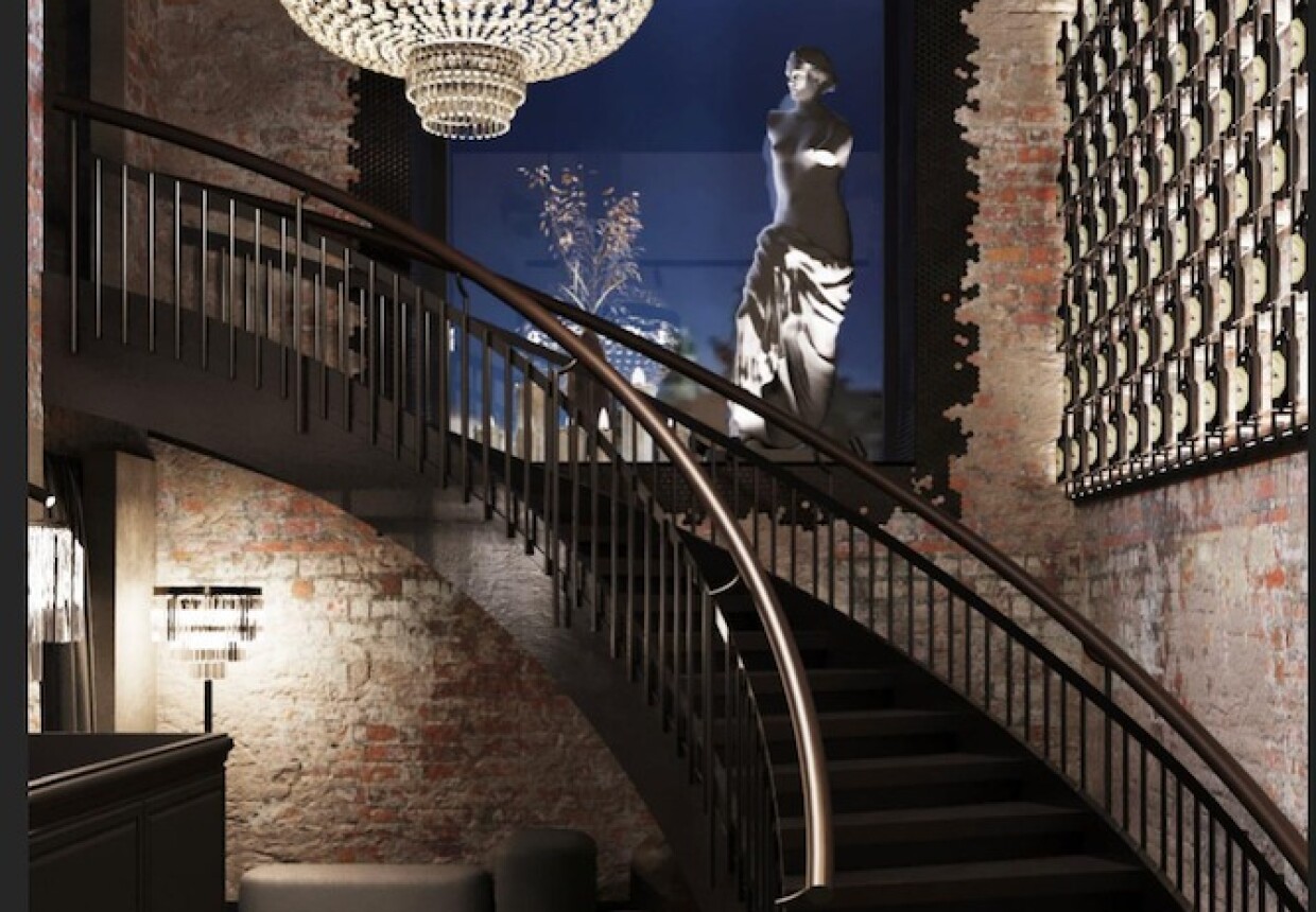 Двухэтажный зал с эффектной лестницей оформили в духе богемной эклектики: небрежно оштукатуренные стены, объемные люстры-дискошары, статуи в античном стиле и стеллажи с винными бутылками