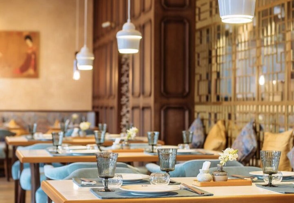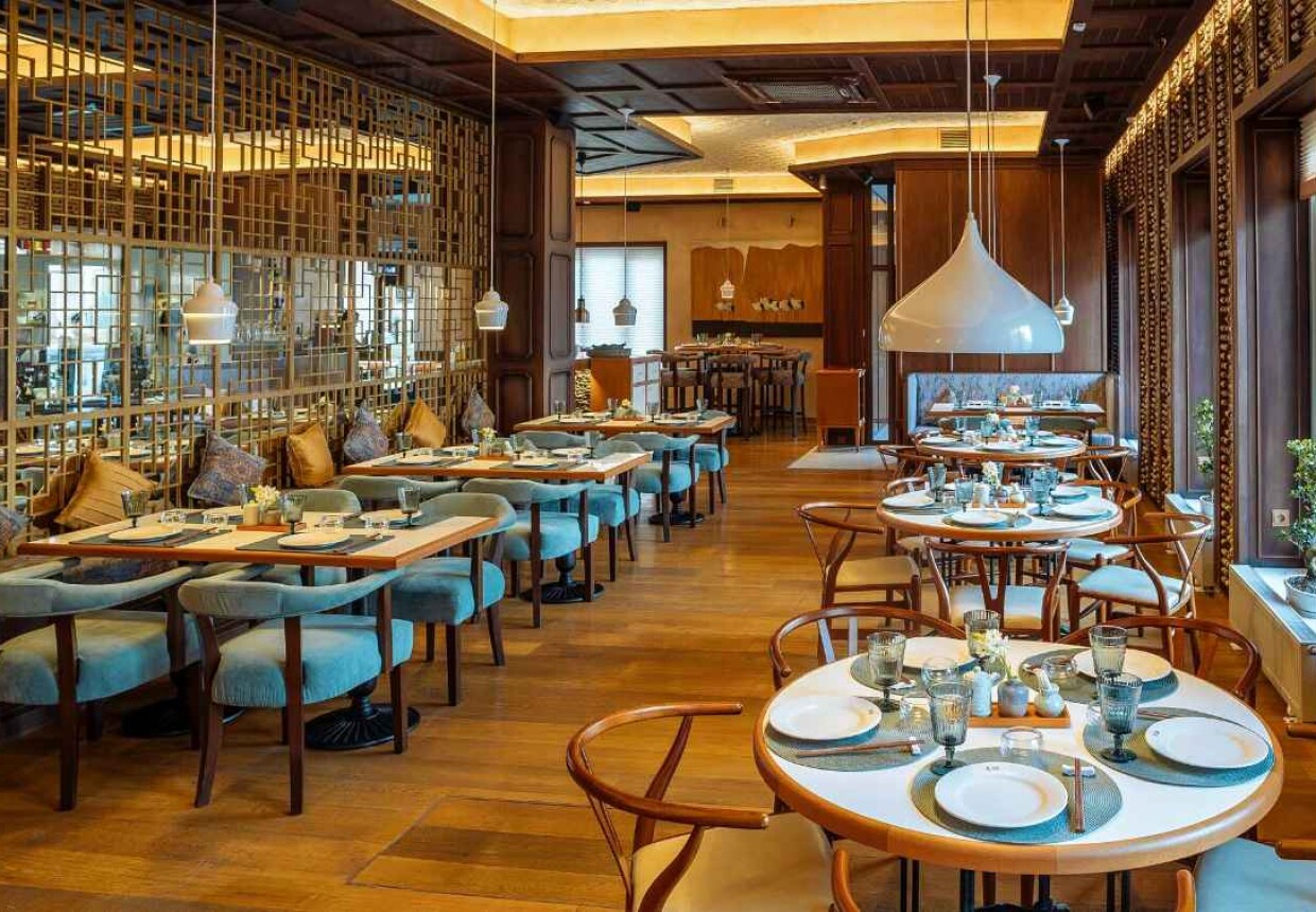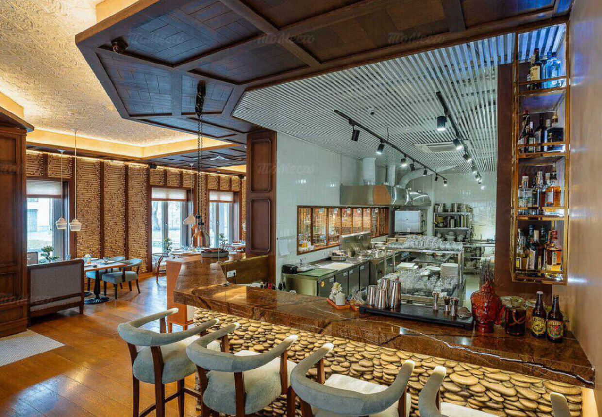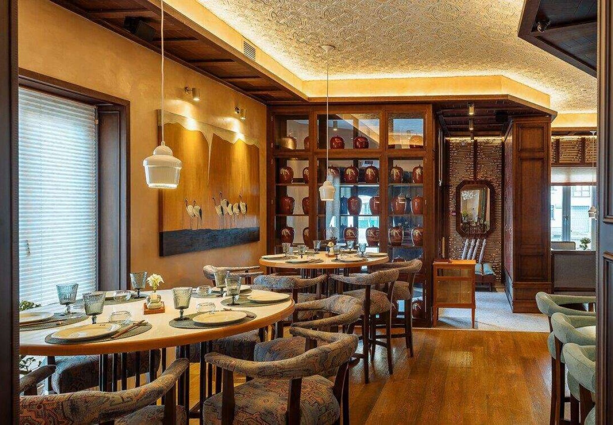 Внутри просторно, светло и уютно. Дизайн-проект опирается на привычные европейские паттерны: много древесины, сдержанные тона, тёплое освещение. Но ненавязчиво, без «клюквы», намекает на восточную идею ресторана: через гравюры, бумажных журавликов, яркую расписную ширму, украшения в виде красных фонариков. Помимо основного зала здесь есть отдельная уютная комната на восемь человек.