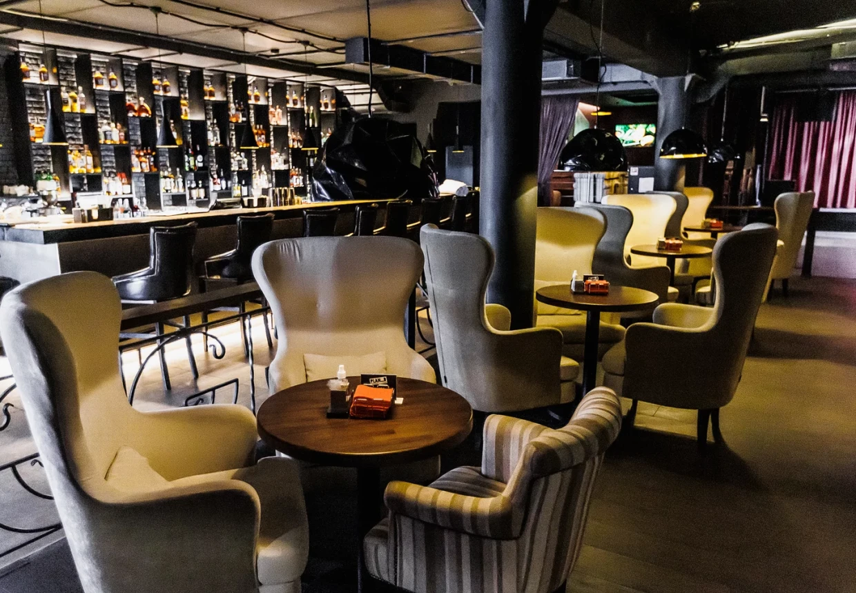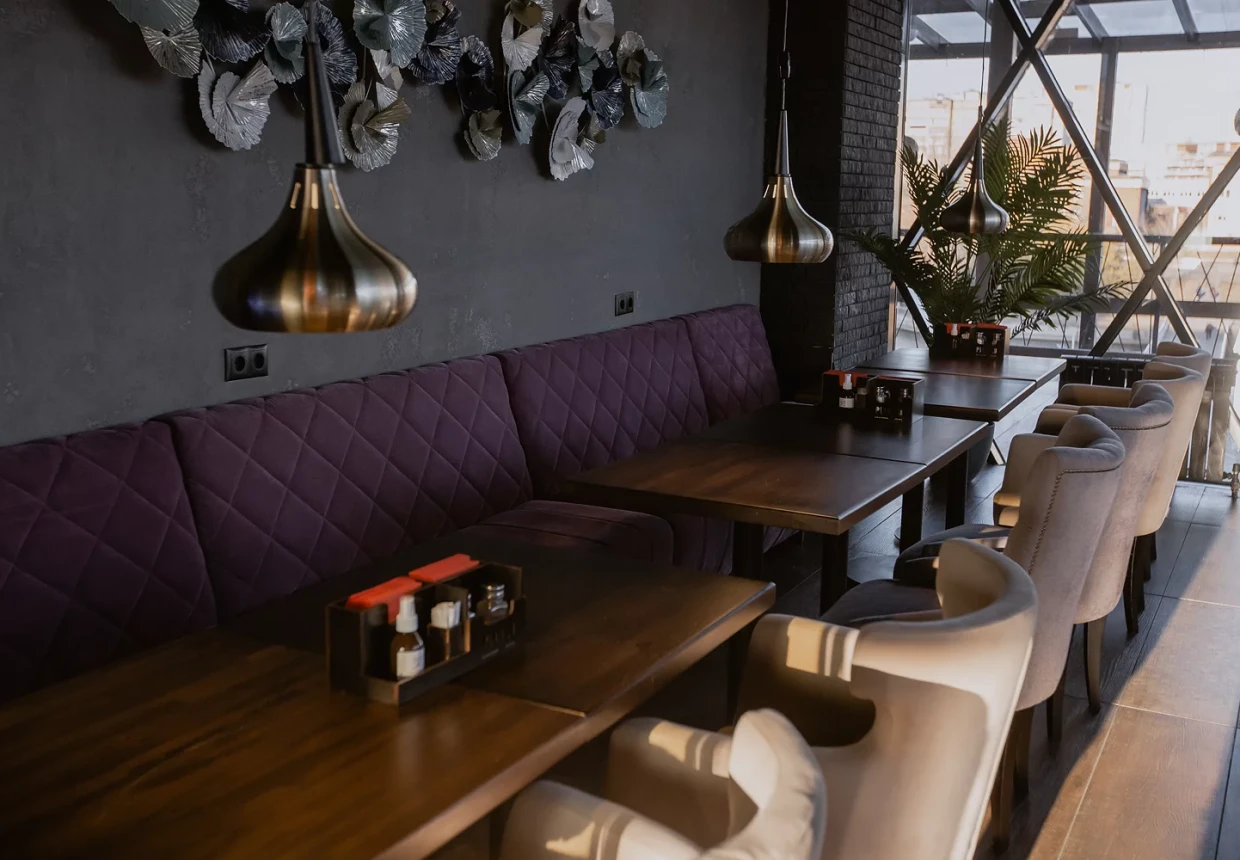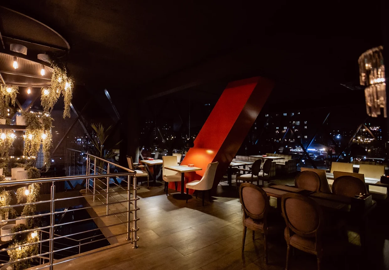 В ресторане, занимающем три этажа, есть восемь разноформатных зон и четыре банкетных зала. Масштабный проект способен вместить восемьсот приглашённых, предложить для любого формата идеальные условия: камерную атмосферу или большой танцпол, уютные диванчики на двоих или коммунальный стол для компании. Парадный белоснежный зал для банкетов соседствует с современной гостиной, где у панорамных окон расставлены кресла во французском стиле, а между этажами разместилась огромная многоярусная люстра, украшенная живой зеленью. Летом открывается большая терраса.
