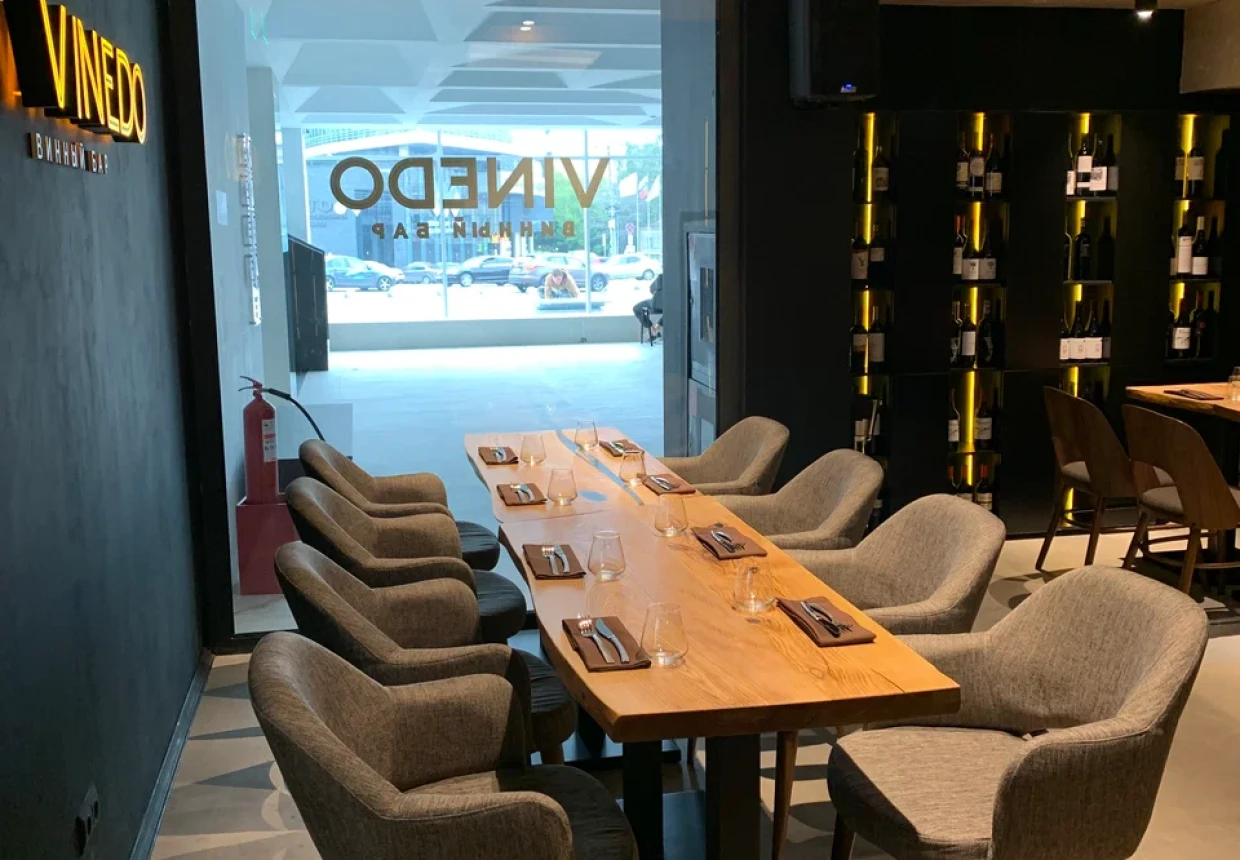 К приятному отдыху располагают расслабляющая атмосфера и спокойный интерьер в классическом стиле и естественных природных оттенках. Гармония натуральных материалов подчёркивается комфортным приглушённым освещением и сочной зеленью ухоженных растений. Удобные кресла с подушками, отсутствие пёстрого декора, мягкая подсветка, стеллаж, на котором разместили около 350 экземпляров из энокарты, открытая кухня — здесь всё продумано до мельчайших деталей, чтобы отдых с друзьями или второй половинкой наполнился положительными эмоциями и подарил массу ярких мгновений.
