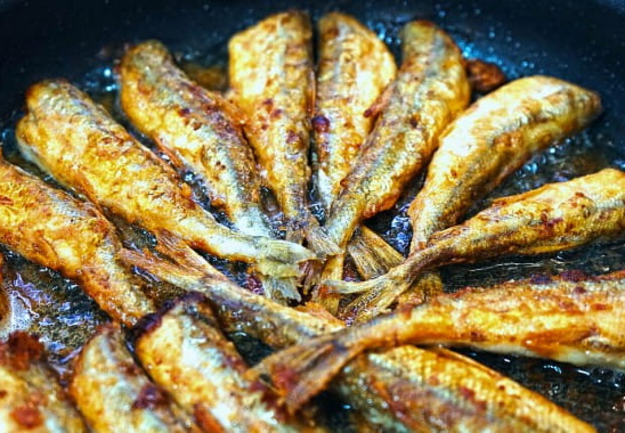12:00 - Обед. Жареная корюшка, навага, горячий чай.